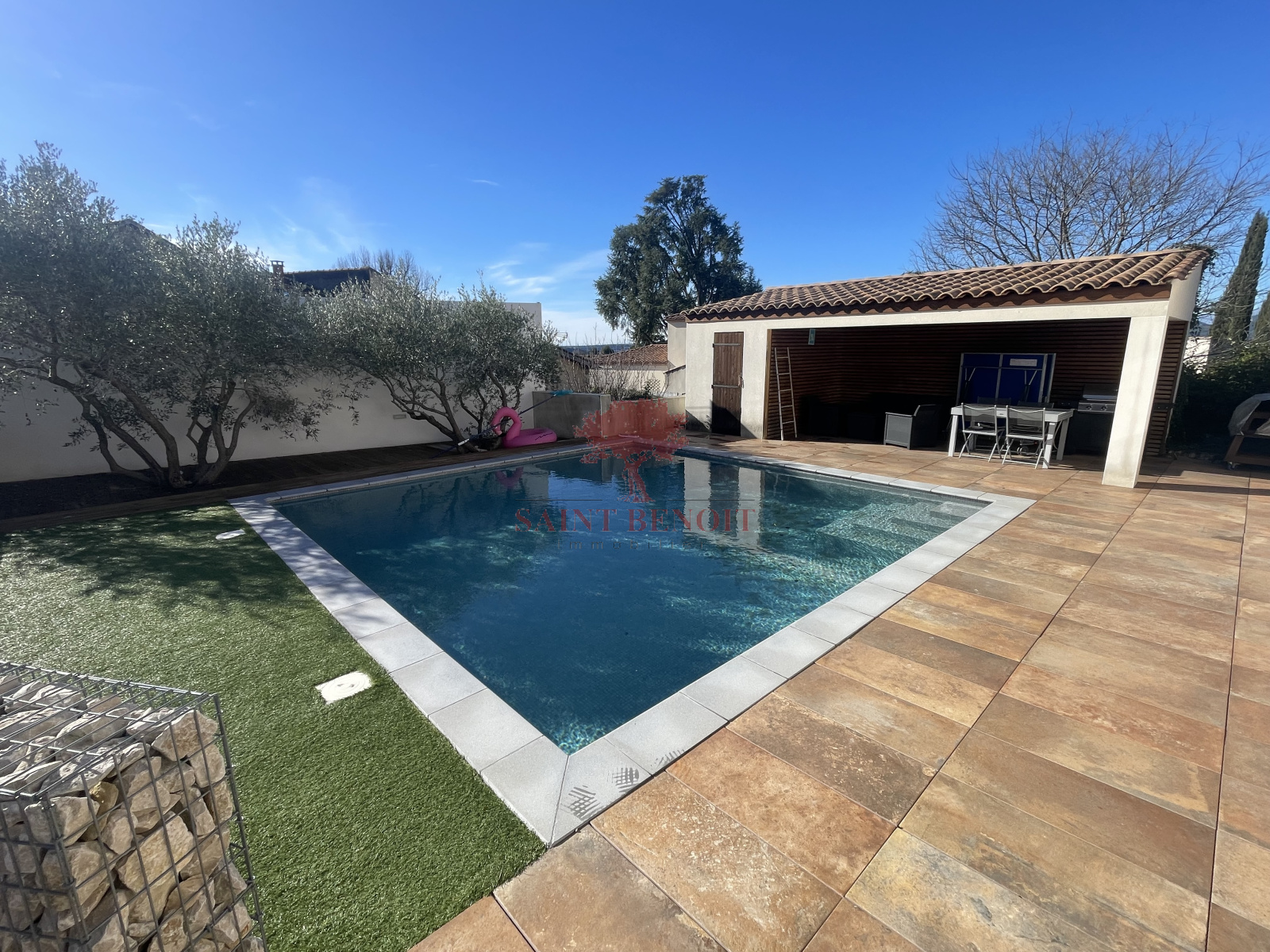 À l’extérieur, place à la détente : une terrasse de 38 m² prolonge harmonieusement la pièce de vie, et une piscine traditionnelle 6x6 au sel, avec son abri, vous promet de beaux moments en famille ou entre amis.