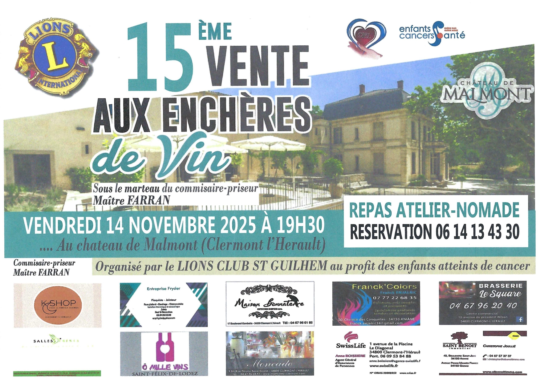 Un bon moment à partager pour une noble cause : réservez au Château Malmont, Vendredi 14 Novembre à 19 h 30, une soirée organisée par le Lions' Club de Saint-Guilheme au profit de l'Association Enfants Cancers Santé. 06-14-13-43-30 pour réserver !