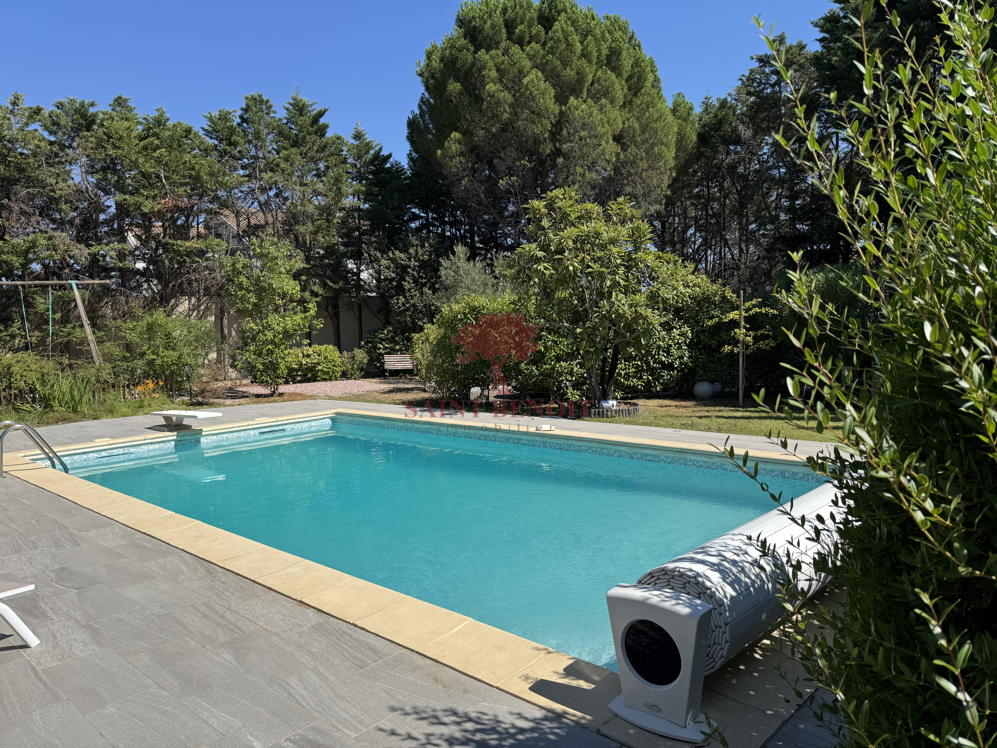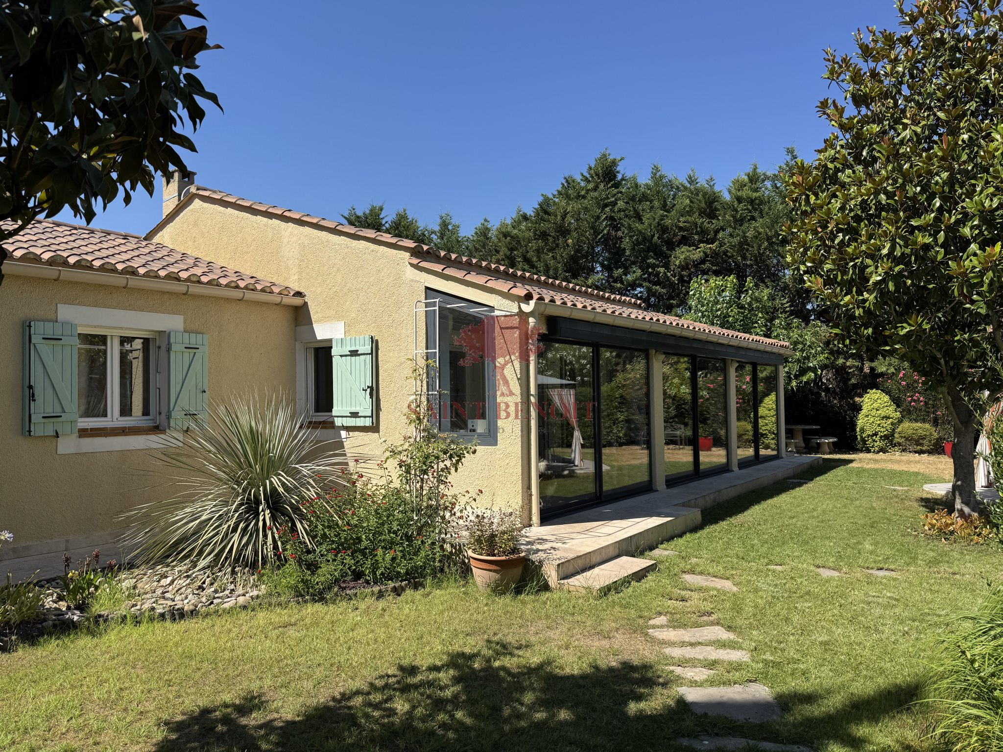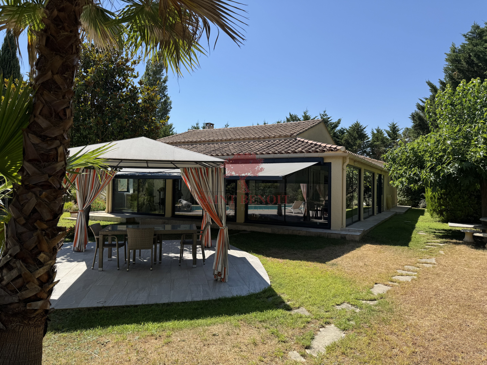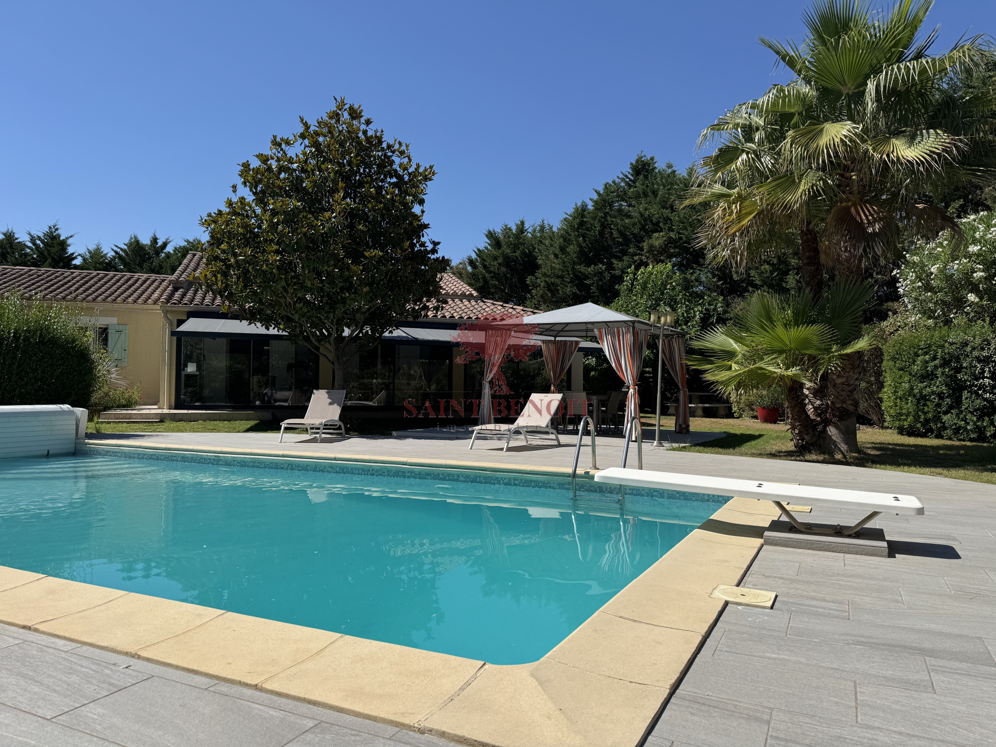 A 25 mn à l'ouest de MONTPELLIER, Dans un environnement calme, superbe maison de plain-pied de 220 m² habitables, rénovée en 2011, entièrement climatisée, dans un écrin de verdure de 2092 m², clôturé et très arboré mis en valeur par un éclairage nocturne. Très belle pièce à vivre de 68 m² avec une cheminée-insert, une cuisine entièrement équipée, ouverte sur une grande véranda trés lumineuse de 48 m², 4 chambres, une salle de bains et une salle d’eau avec WC, un WC indépendant, de nombreux placards, un cellier, garage. Une piscine traditionnelle 5x10, équipée d’un plongeoir d’une échelle et d’un rideau couvrant de sécurité, pool house et abri de jardin. Prestations de qualité : arrosage automatique avec l’eau du Canal de GIGNAC. Pour toute visite, contactez M. Jean-François SOULIER de l’agence Saint-Benoit-Immobilier, à Aniane ou Gignac.